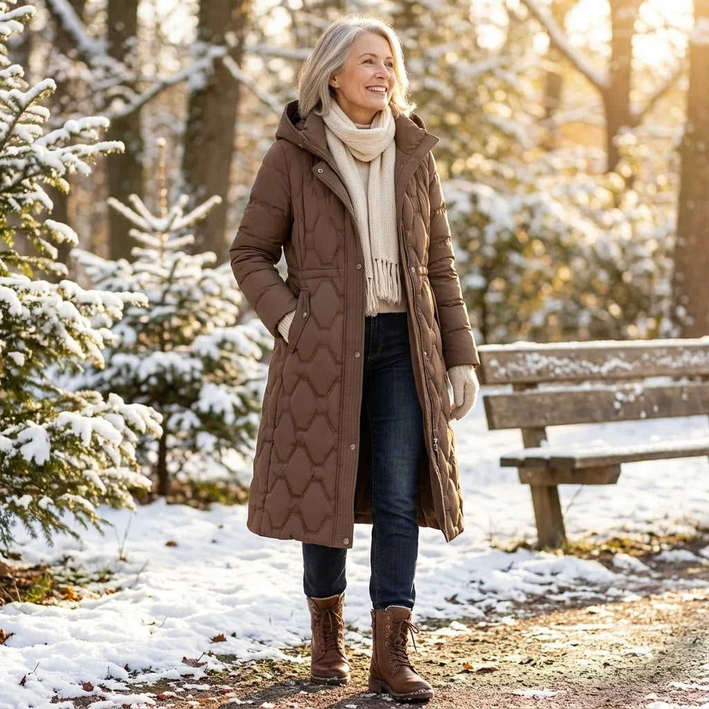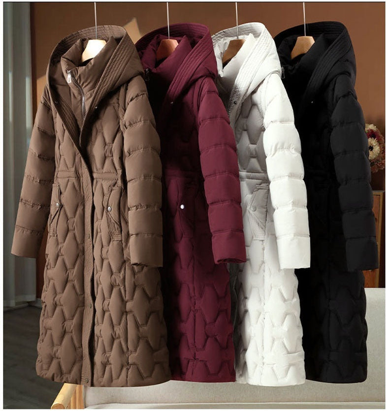 Branimira – Długi Płaszcz Puchowy z Kapturem